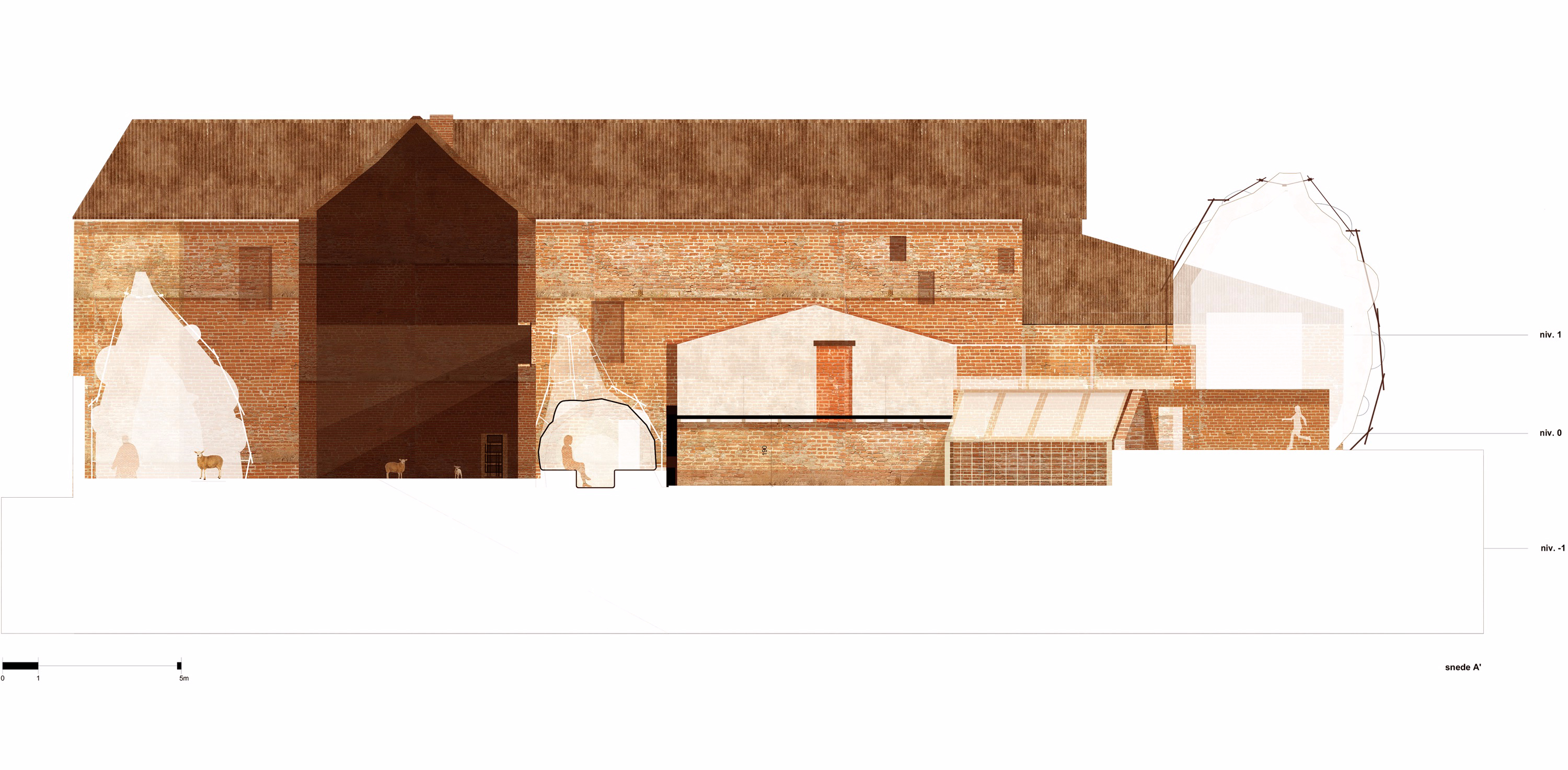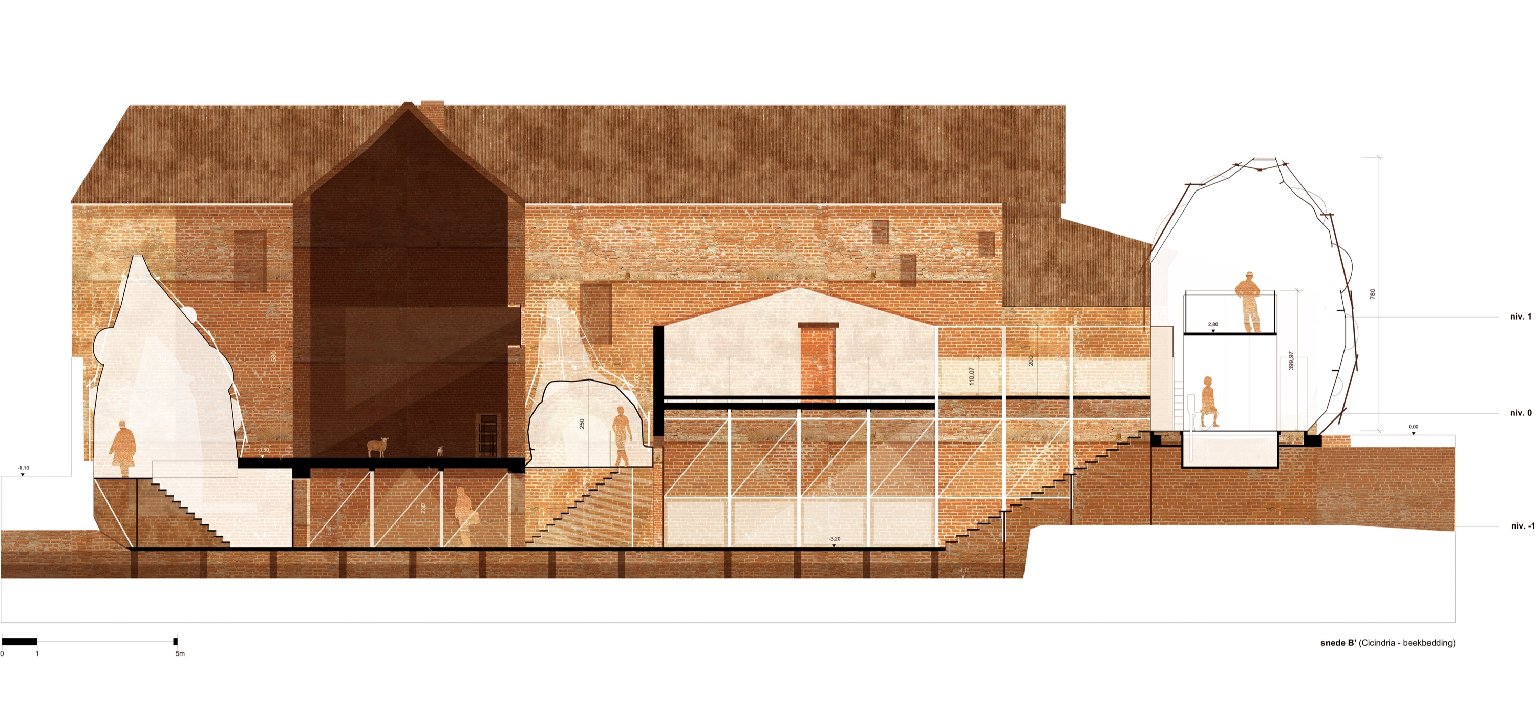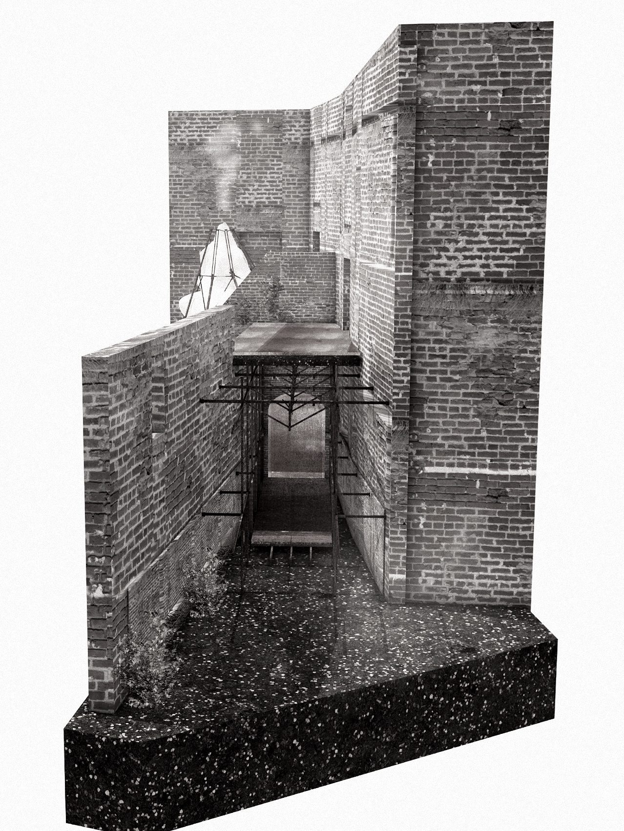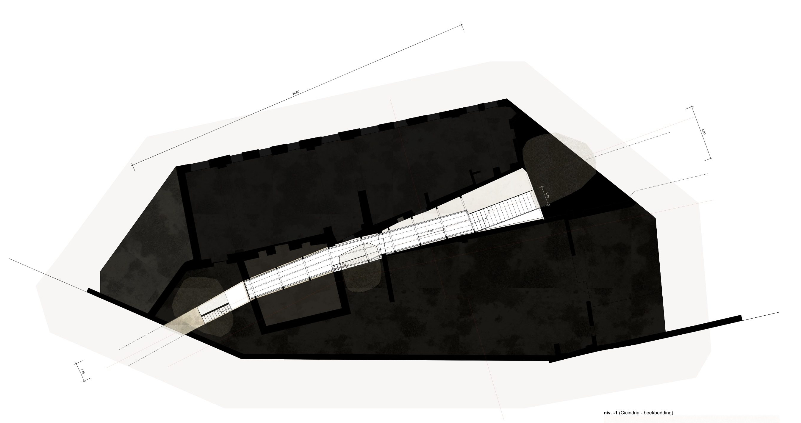 Location: Sint-Truiden, Abbey (street) / (eng.) During the night of August 5, in 1992, the glory of a place in the city center (Sint-Truiden) was brutally damaged by an underground methane gas explosion. The before and after situation of the area is clear. A spontaneous decay gradually occurred but remained hidden behind the abbey wall and a temporary fence. This research started with wondering how to ensure that this place regained its visible part of the city. How can curiosity be cultivated for what was once a private (and commercial) place and still seems to be like that (but not commercial anymore), but above all, how do we capture this "unseen" moment scenographically? Allowing and even embracing decay and degradation is approached as a design method. The materialization and shape of the new design are associated with the story of the place. This was assessed through a historical and geological research with a poetic approach as a connecting factor with the design and influence to capture an image of the absent (story) information. (University of Hasselt, Belgium) - nominated for 2 architecture competitions. - THE SCENE (eng.) (1) "Poetry is an elusive aesthetic experience" (Poëzie verrijkt het leven, 2020). Likewise, the explosion during the night of August 5, in 1992, was an untouchable fact. The tragic moment itself was/is not exactly something to describe as a poetic phenomenon, but the images that developed around it trigger double thoughts, such as the romantic idea of a ruin. Making such an elusive aesthetic experience touchable is a search for scenographic capturing of the missing moment: the underground methane gas explosion at the abbey mill. (2) The unit has no closed extern material. However, a consciously chaotic open construction is visible that refers to the wooden construction of the former mill house. This is a direct association with the moment of the destructive gas explosion, but also an honest way for me to deal with architecture. The closed interior of the unit follows the profile of bulging round shapes to the outside, as a second reference to the pressure created by the gas accumulation. (3) Due to the time of this one-off scene, 2:30 am, the number of spectators was obviously limited. Going back to this time may, however, attract spectators in the new design. A new function as an overnight unit and as a place for performances fits within this idea. In this way, the place becomes a visible part of the city again, not only through the shape of the design but also through a few new functions. The main intervention is to make this originally private environment partly public and accessible. The shape of the new design further elaborates on this scene. (4) the design Together with the story, the current relief of the place has also created the design. The old underground stream bed that was opened up by the unexpected gas explosion seems to be lying dry. The design must be able to withstand a water flow if it were there. The above-ground part consists of different usage levels. The design idea was formed from the underground stream as the core of the "unseen" gas explosion and the subsequent deterioration. The stream bed is open in three places. This unintentionally visible bed is an important part of the design, because here an underground connection will be visible above ground in those three places. (5) the scene The design of the design contains several references to the previous story. The outer shapes of the unit, which appear above ground in three places, are based on the explosion. At the top there is an oculus in each unit top. Under one of these three peaks there is a sweat lodge, referring to the gas accumulation and fermentation of the methane gas due to the underground heat development in the stream. The steam from the sweat lodge will escape through this one oculus. This also partly refers to Scandinavian homes and their temporary living spaces. The other two visible parts of the unit contain a sleeping area and a semi-public area with a wet room. This first space can also serve as a studio and as an exhibition space for the resident artist. The entire design aims to stage the story of the place in a poetic way. Both outside and inside the units, the past speaks to the visitor in a visible and tangible way. (6) artist in residence A rebuild of the mill house was not necessary as the mill already lost its function when it was replaced by an electric version. The remnants of the wheel are shown within the new design, but the focus is mainly on the gas explosion of August 5, 1992. Referring to the explosion at half past three at night, but also to the nearby Cicindria hotel, which was then forced to close, forms the design revolves around the function as a temporary residence. The city of Sint-Truiden likes to attract artists. In exchange for a performance, performance, etc., you can stay in the heart of the city center. The existing platform (p1) transforms into a stage (p2), intended for these public events. Not only artists, but also people who just want to rest can stay there when there are no events planned.