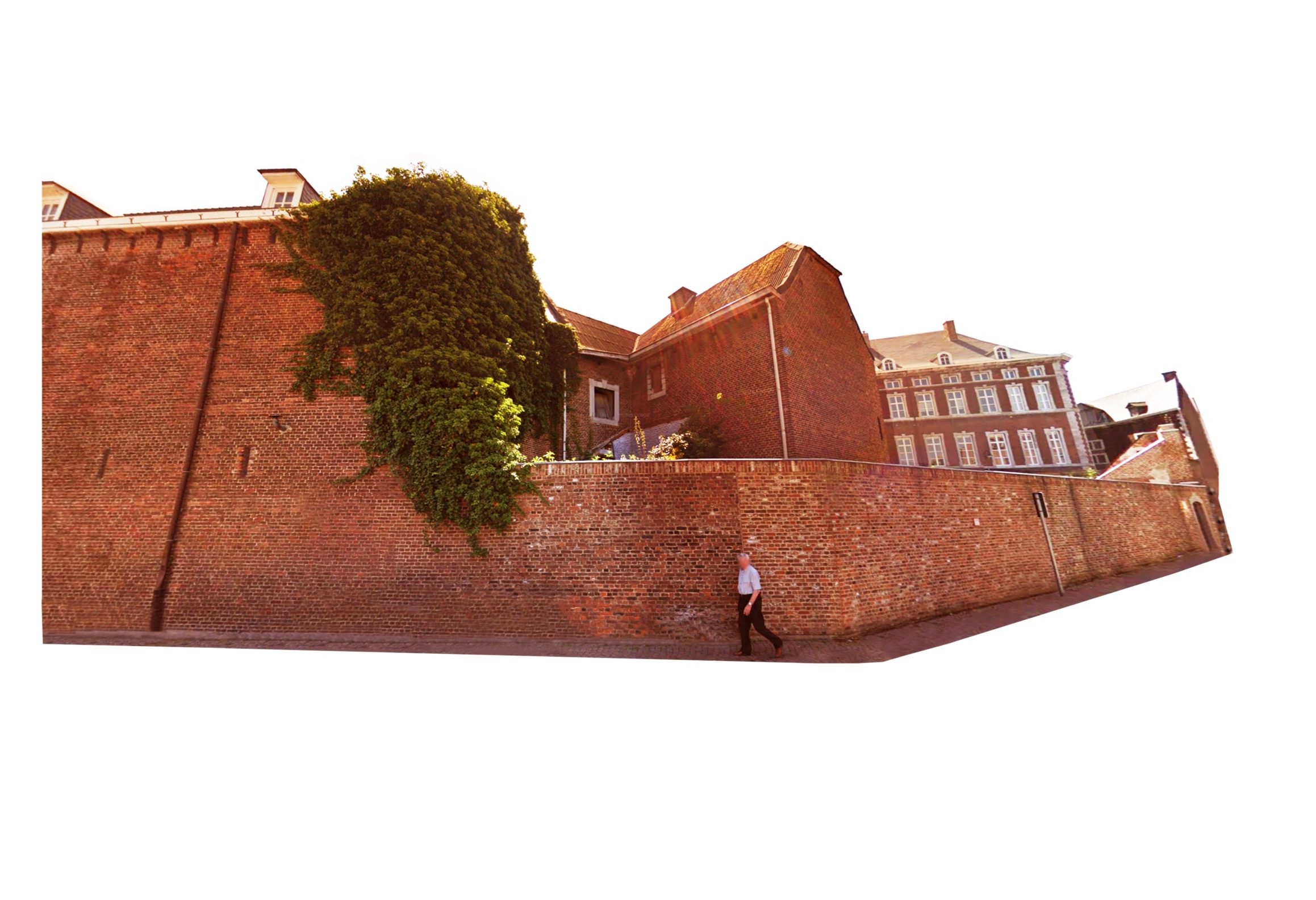 Locatie: Sint-Truiden, Abdij(straat) / (nl.) Tijdens de nacht van vijf augustus 1992 is de glorie van een plek in het centrum van Sint-Truiden (stad) bruutweg beschadigd door een methaangasontploffing. De voor- en na-situatie is duidelijk. Een spontaan verval trad gaandeweg op maar bleef verstopt achter de abdijmuur en een tijdelijke schutting. Hoe laten we deze plek weer een zichtbaar deel zijn van de stad? Hoe wordt er nieuwsgierigheid gewekt naar wat ooit een private omgeving was en dat nog steeds lijkt te zijn maar vooral, hoe leggen we dit ‘ongeziene’ moment scenografisch vast? Het toelaten en zelfs omarmen van het verval en de verloedering wordt benaderd als ontwerpmethodiek. Hierbij worden de materialisatie en de vorm van het ontwerp geassocieerd met het verhaal van de plek. Dit werd onderzocht via een historisch en geologisch onderzoek met een poëtische benadering als verbindende factor met het ontwerp en leidde tot het vastleggen van een beeld van de afwezige informatie van het verhaal. (2020, Universiteit Hasselt, België)